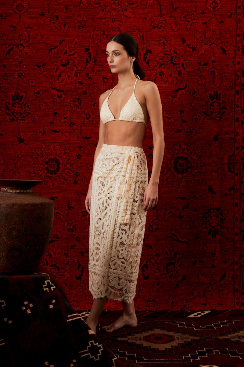 Primero, los prints: composiciones gráficas que condensan el universo simbólico de la colección. Luego, las siluetas: pensadas para múltiples cuerpos, usos y momentos. Piezas que transitan con naturalidad entre playa, resort y noche, sin necesidad de transformarse.