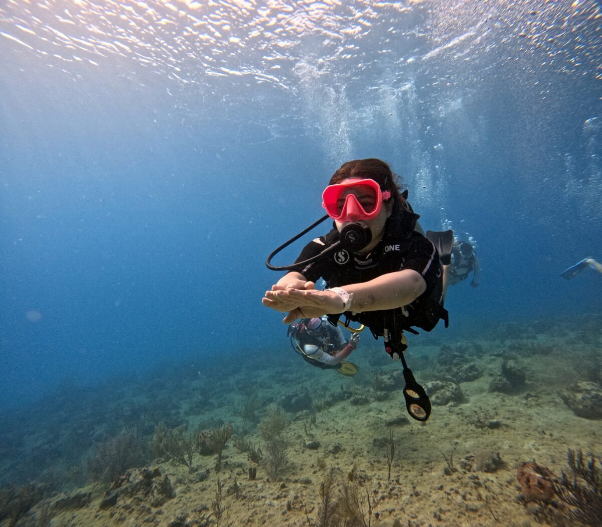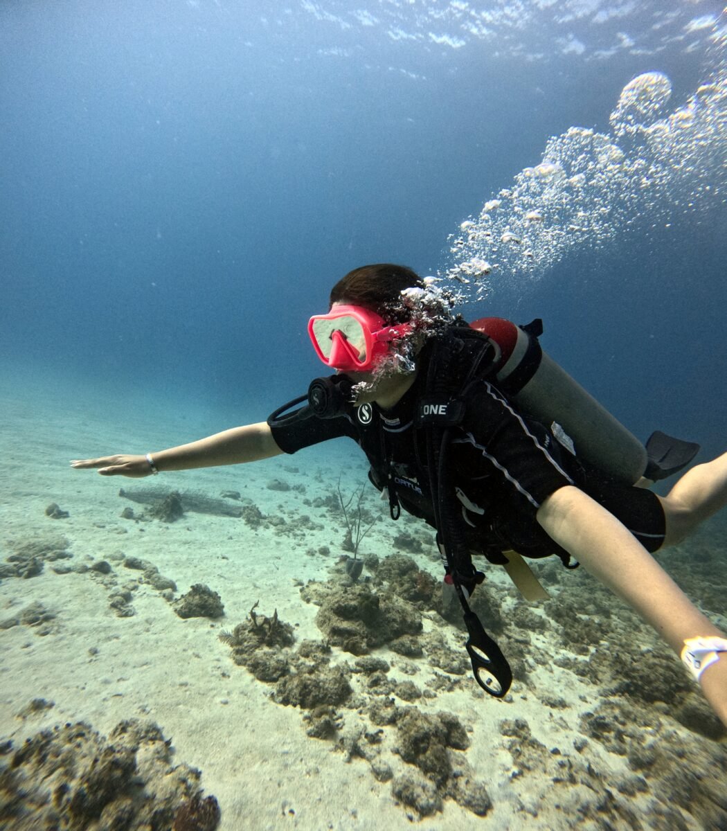 Cuando finalmente se pasa al mar en Isla de San Andrés, el cambio es evidente. Ya no hay bordes ni referencias cercanas. La respiración se vuelve consciente, más lenta, más medida. Al inicio cuesta. No es natural respirar solo por la boca ni depender de un equipo.