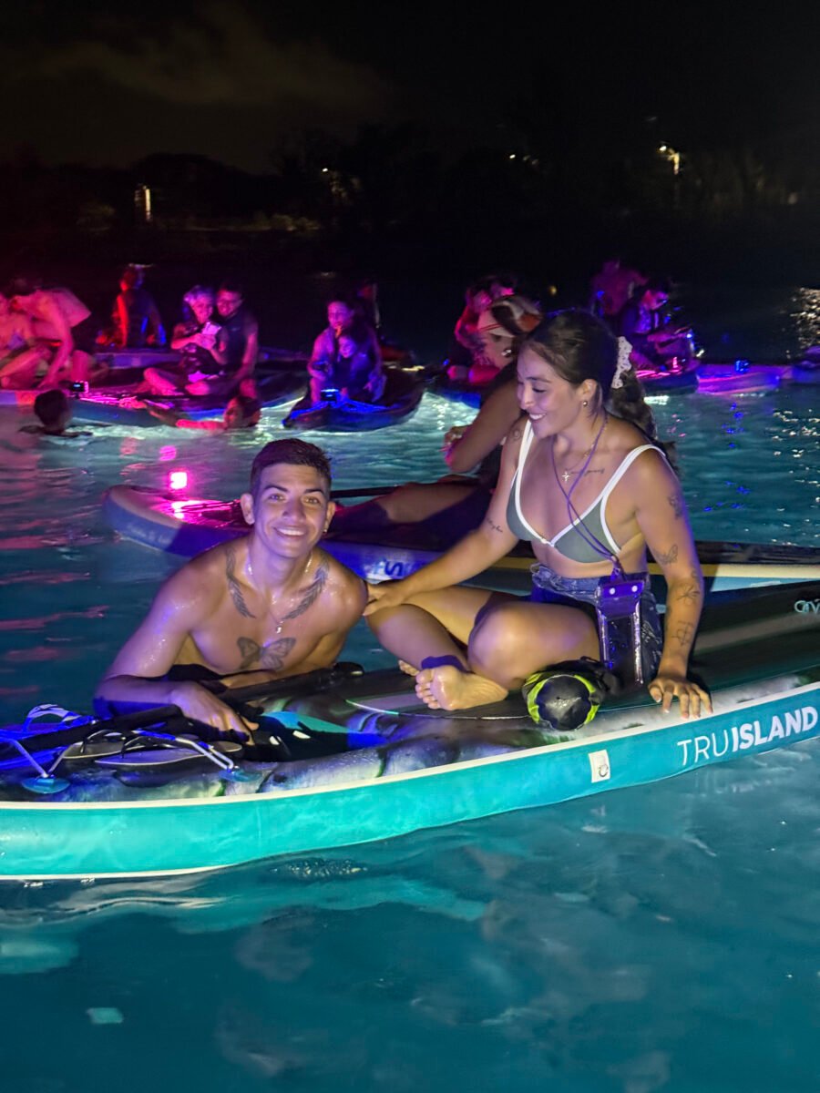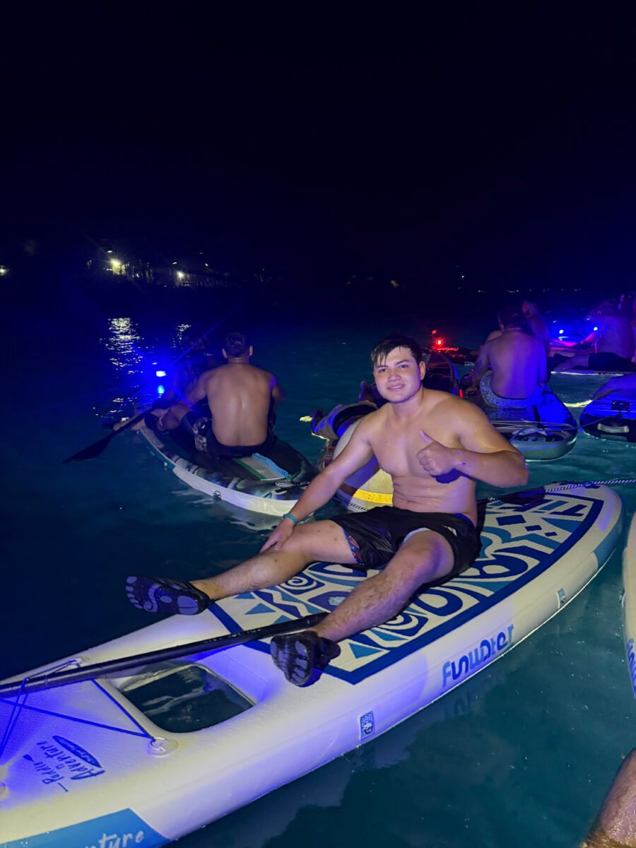 La operación está pensada para no afectar el entorno. No usan motores, no hay combustible, todo se mueve a remo. Las luces son recargables y trabajan en zonas específicas, bancos de arena con profundidad controlada, evitando áreas de coral activo. Además, insisten en algo básico: llevar lo mínimo, no introducir plásticos, no dejar residuos. La isla es reserva de biosfera y eso define cómo operan.