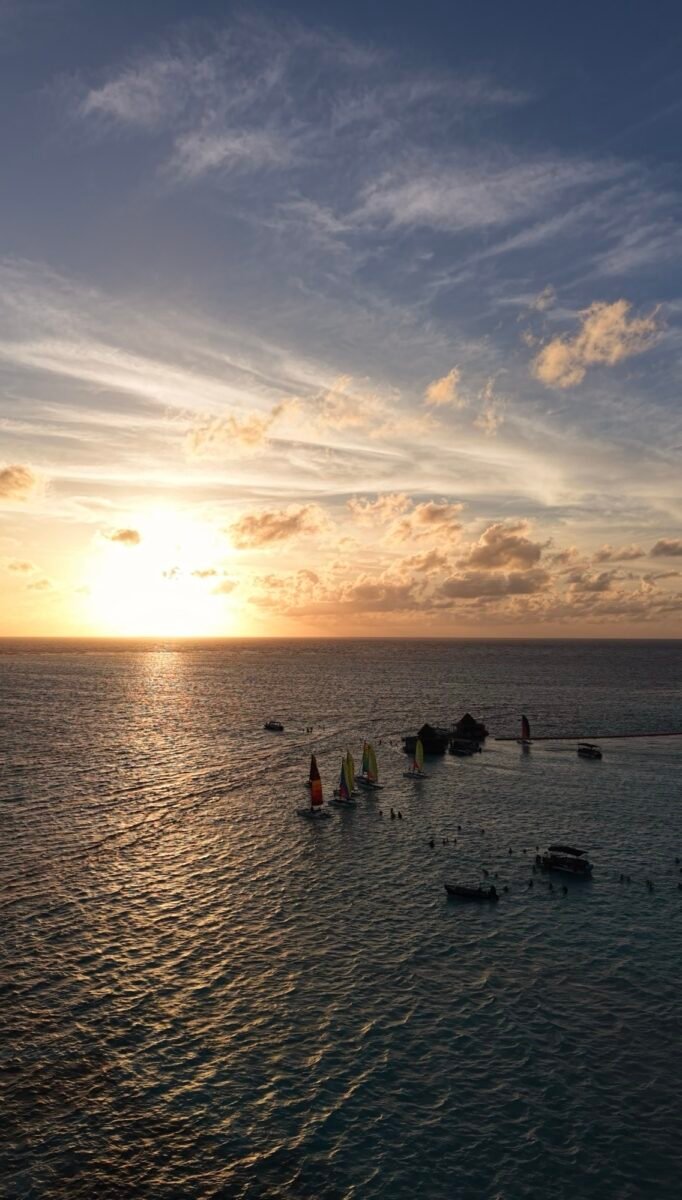 Remar en ese momento no requiere esfuerzo extra, pero sí atención. El trayecto te lleva mar adentro, hacia un punto donde el atardecer se ve sin interrupciones. Los colores cambian rápido, algunos días más intensos que otros, con tonos que van de naranjas a rosados y azules más densos. No es algo que se construya, es parte de cómo se comporta la isla a esa hora.