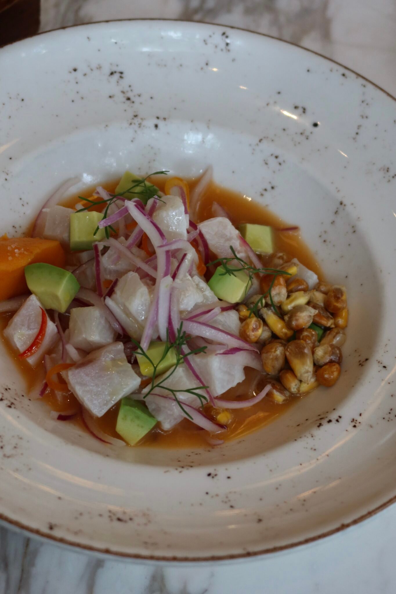 El ceviche oficial se erige como un manifiesto de la casa: un clásico peruano reinterpretado con respeto y audacia. Trozos frescos de pescado descansan en una leche de tigre de rocoto que equilibra acidez y picante con exactitud quirúrgica. La palta, en su cremosidad, suaviza el conjunto y aporta un contrapunto que vuelve al plato casi adictivo.