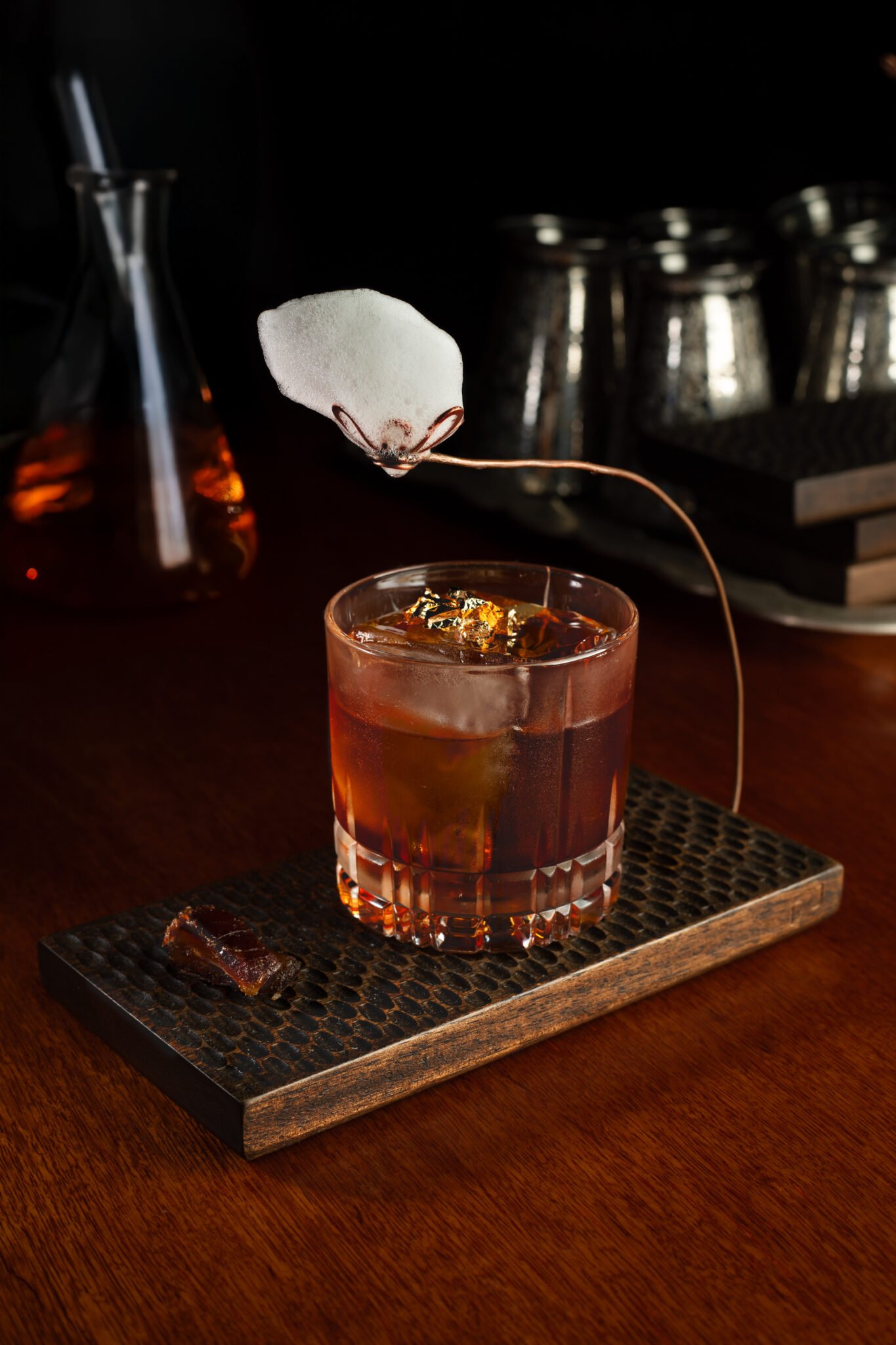En el primer piso, bautizado como «El Origen«, la estética remite a los años 30. Aquí, el imaginario gira en torno a los alquimistas, los monjes boticarios y la revolución industrial europea. Los tragos evocan la alquimia primitiva de los primeros aperitivos herbales, con notas terrosas, especiadas y místicas.